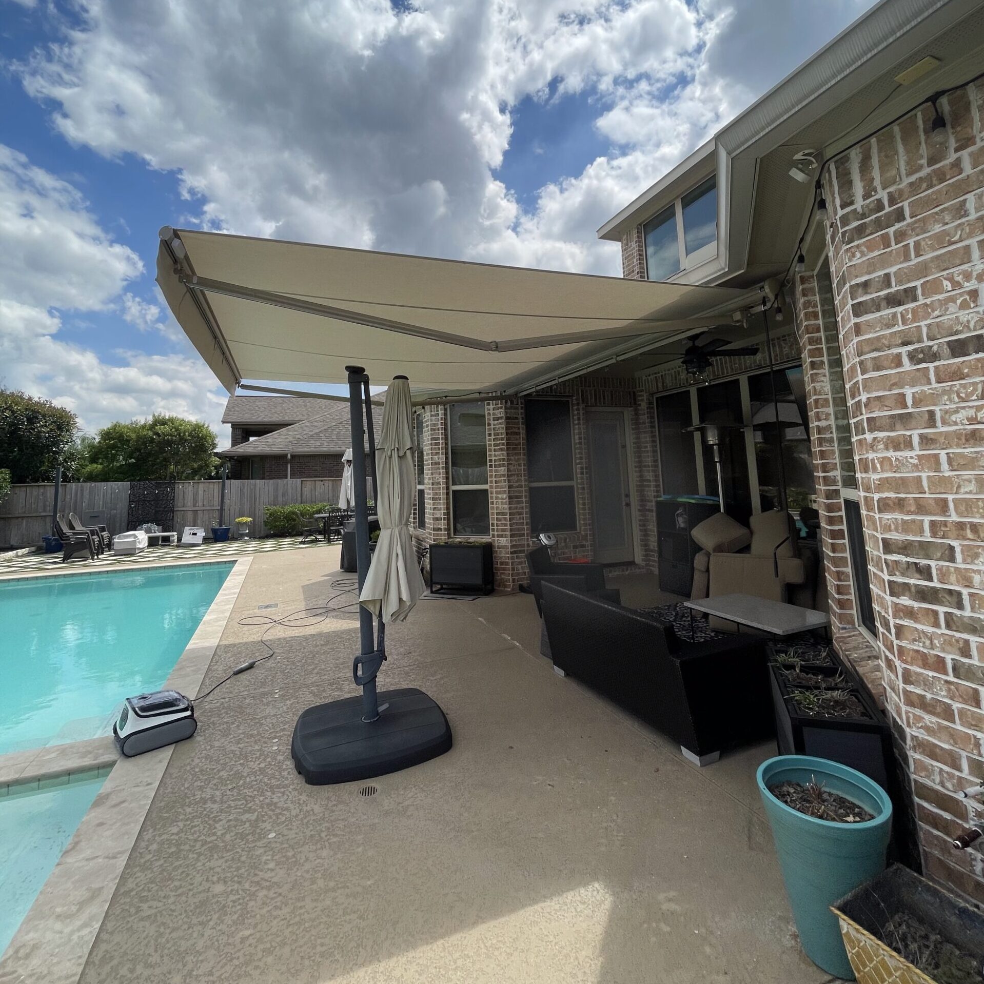 Motorized retractable awnings are one of the BEST options to provide horizontal protection over an existing patio or pool. Teaming up with one of the best manufactures in the industry, the sizes are almost limitless (8 feet to 40 feet wide and 8, 10, and 12 feet projection).